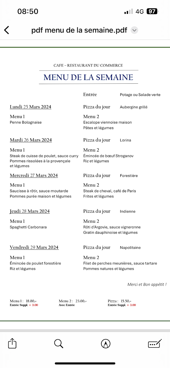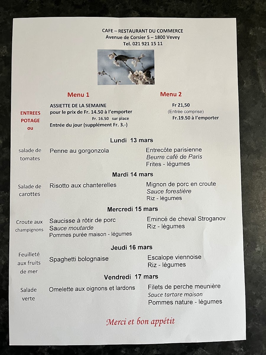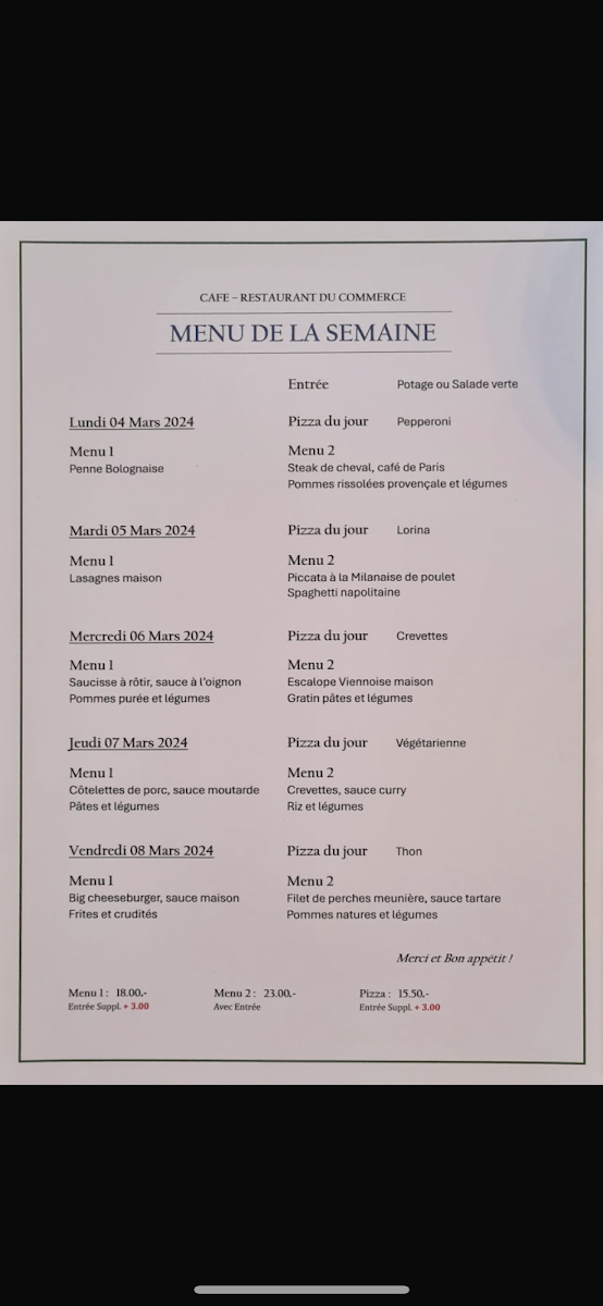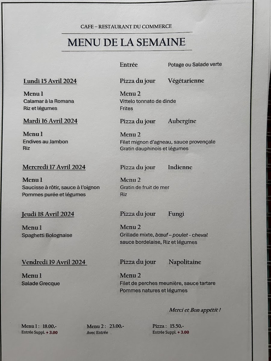 Café Restaurant Du Commerce offers a delightful selection of traditional Swiss dishes that cater to a variety of tastes. The highlight of the menu is the Fondue, a classic Swiss favorite that delivers a rich, creamy experience, perfect for sharing with friends or family. For those looking to complement their meal, the Verre de Vin Rouge is a great choice, offering a smooth, well-balanced red wine that enhances the flavors of the food. The side dish Pommes Purée Maison is another standout, featuring velvety mashed potatoes that are both comforting and flavorful, making it the perfect accompaniment to any main course. Whether you're enjoying a casual meal or a more intimate dining experience, the menu at Café Restaurant Du Commerce offers something for everyone, with dishes that highlight the best of Swiss cuisine.