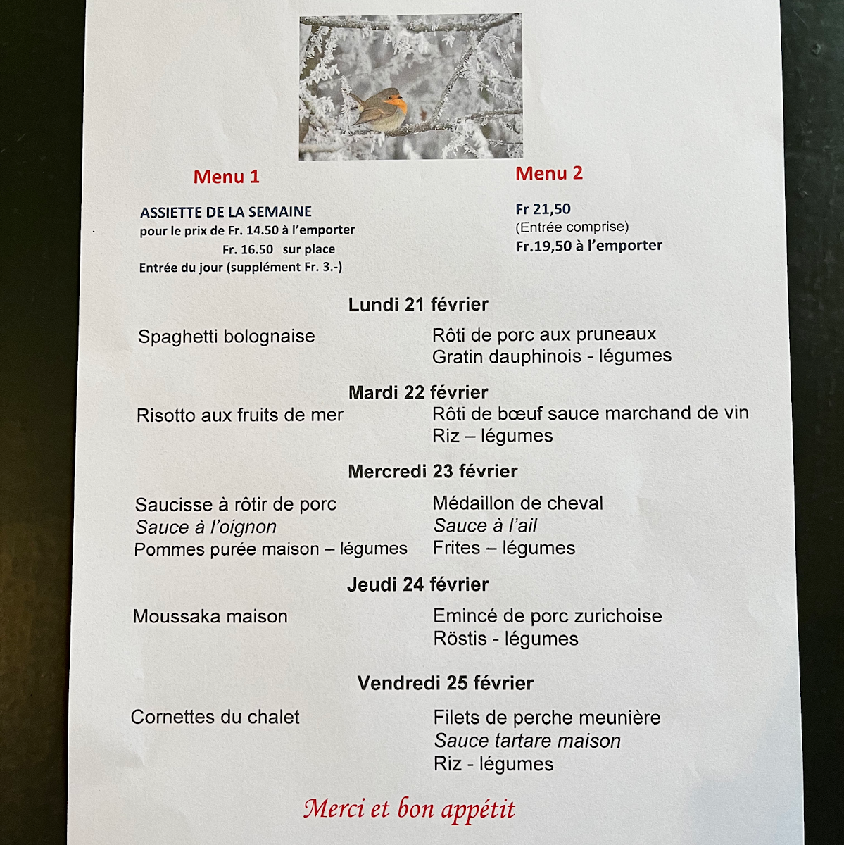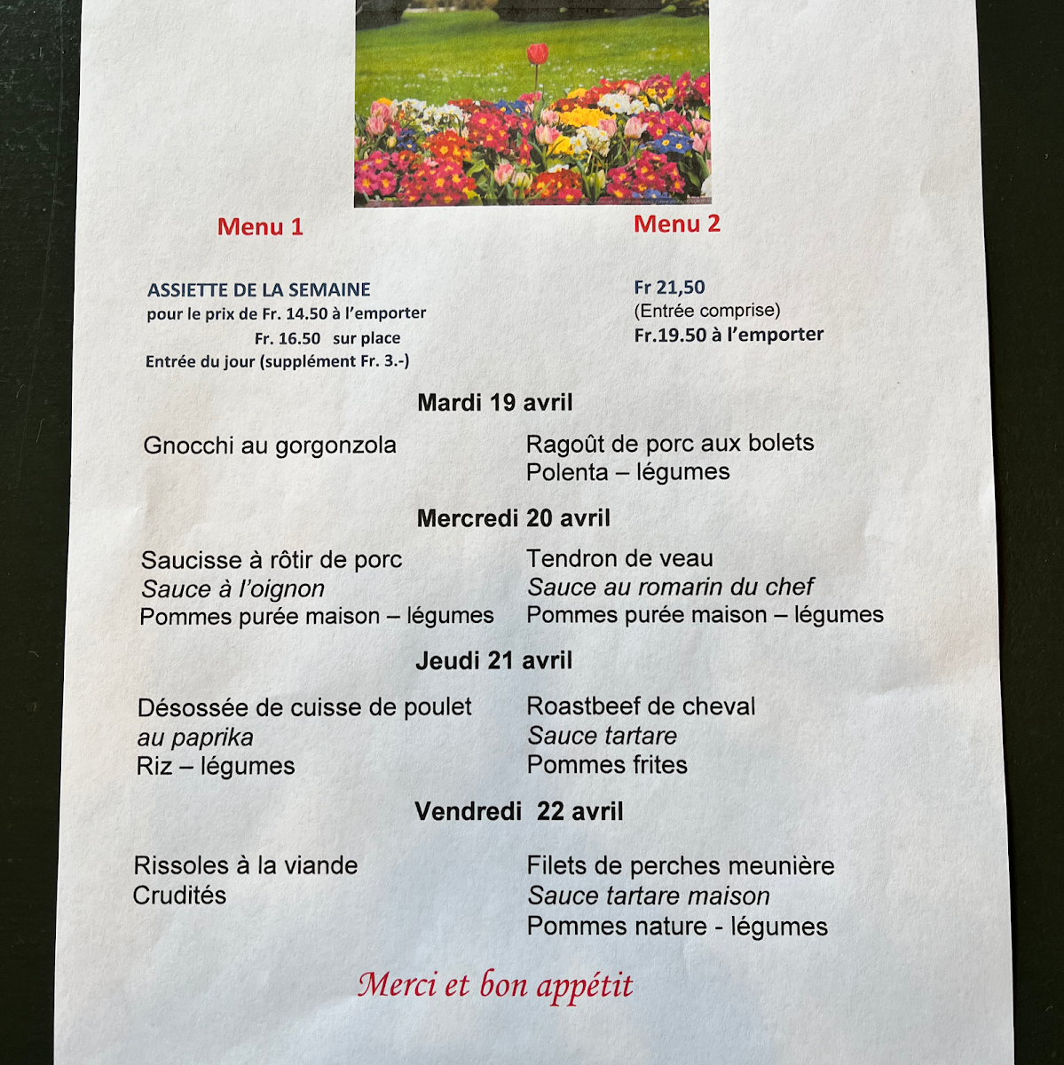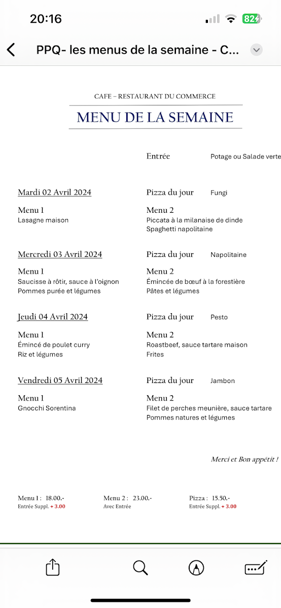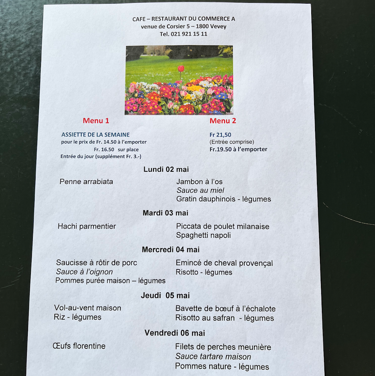 Café Restaurant Du Commerce offers a delightful selection of traditional Swiss dishes that cater to a variety of tastes. The highlight of the menu is the Fondue, a classic Swiss favorite that delivers a rich, creamy experience, perfect for sharing with friends or family. For those looking to complement their meal, the Verre de Vin Rouge is a great choice, offering a smooth, well-balanced red wine that enhances the flavors of the food. The side dish Pommes Purée Maison is another standout, featuring velvety mashed potatoes that are both comforting and flavorful, making it the perfect accompaniment to any main course. Whether you're enjoying a casual meal or a more intimate dining experience, the menu at Café Restaurant Du Commerce offers something for everyone, with dishes that highlight the best of Swiss cuisine.